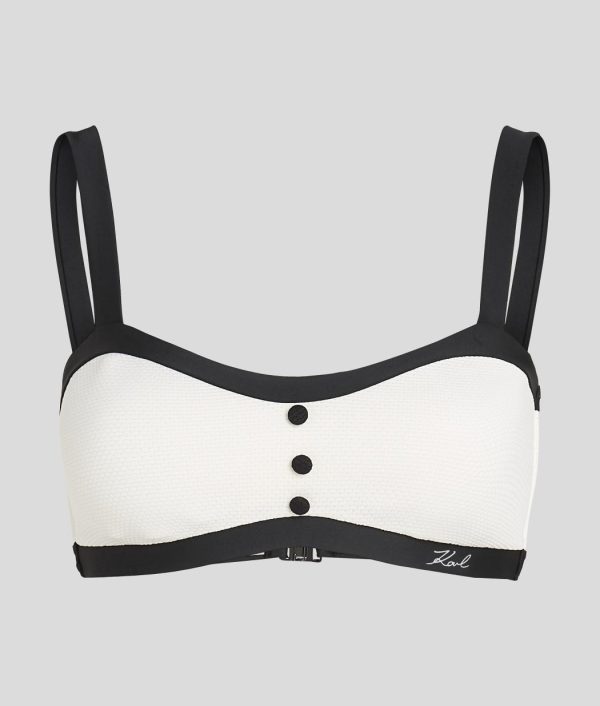 Dieses ultraschicke und mühelos stilvolle Bandeau-Bikini-Oberteil zeichnet sich durch ein auffälliges monochromes Design aus. Verstellbare Träger sorgen für eine individualisierte Passform, während dekorative Knöpfe und das KARL-Signatur-Logo einen Hauch von Flair hinzufügen. Kombinieren Sie es mit dem passenden Bikini-Höschen für eine raffinierte Kombination.