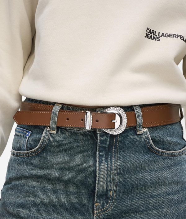 Details im Western-Stil verleihen diesem vielseitigen Gürtel mit der markanten, abgerundeten Schnalle und der Gürtelspitze im Retro-Stil einen besonderen Touch. Die Metallschlaufe ist mit dem KARL LAGERFELD JEANS-Logo verziert.