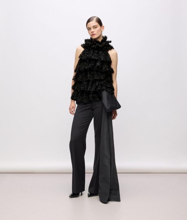 Eine Rüsche. Und noch eine. Und schon ziehen Sie alle Blicke auf sich. Dieses ärmellose Top sorgt mit sanften Wellen für Dramatik: Die kaskadierenden Lagen schwingen bei jedem Schritt wunderschön. Schwereloses Volumen und mühelos beeindruckende Präsenz. Dank einer präzisen Verarbeitung spricht der Kontrast für sich.