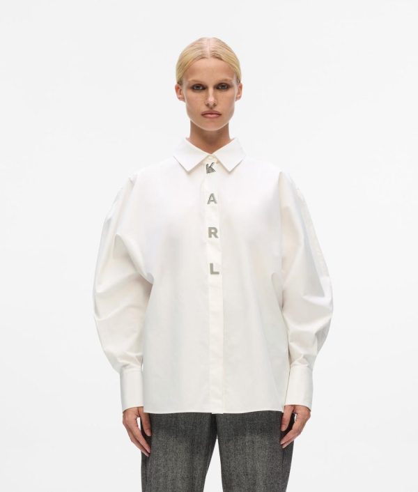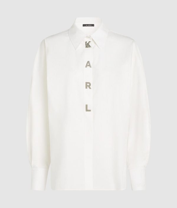 Zeitlose Verarbeitung trifft auf moderne Details in dieser hochwertigen Variante des klassischen weißen Hemdes. Die klare Silhouette aus griffiger Bio-Baumwolle wird durch die auffällige Karl-Buchstabenverzierung auf der Vorderseite veredelt.