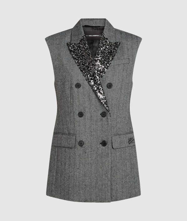 Diese Tweed-Weste besticht durch ihr elegantes, ärmelloses zweireihiges Design und funkelnde Pailletten auf dem Revers. Die Stickerei mit KARL-Autogramm verleiht der Weste eine charakteristische Note und macht sie zu einem unverkennbaren Blickfang.