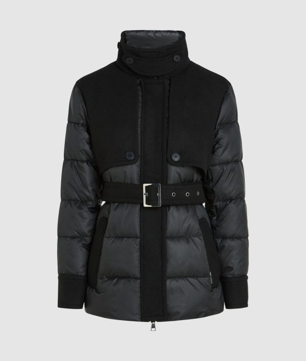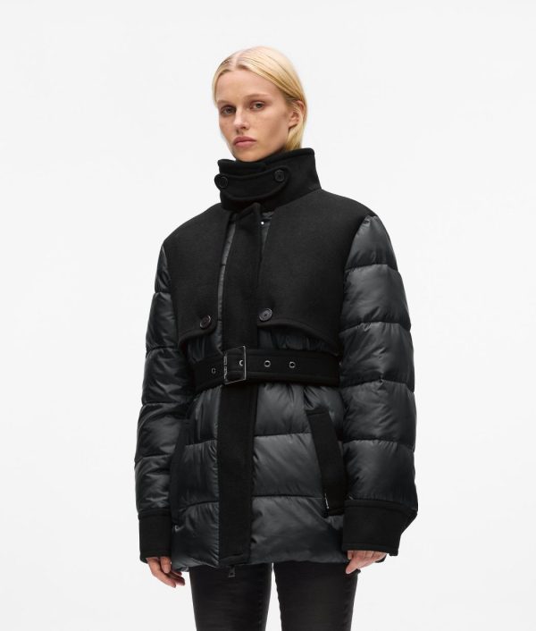 Dieser wattierte Mantel kombiniert glattes Polyester mit kuscheligen Wollakzenten und bietet Wärme und Stil. Ein hoher Trichterkragen und ein verstellbarer Taillengürtel schaffen eine individuelle, moderne Silhouette.