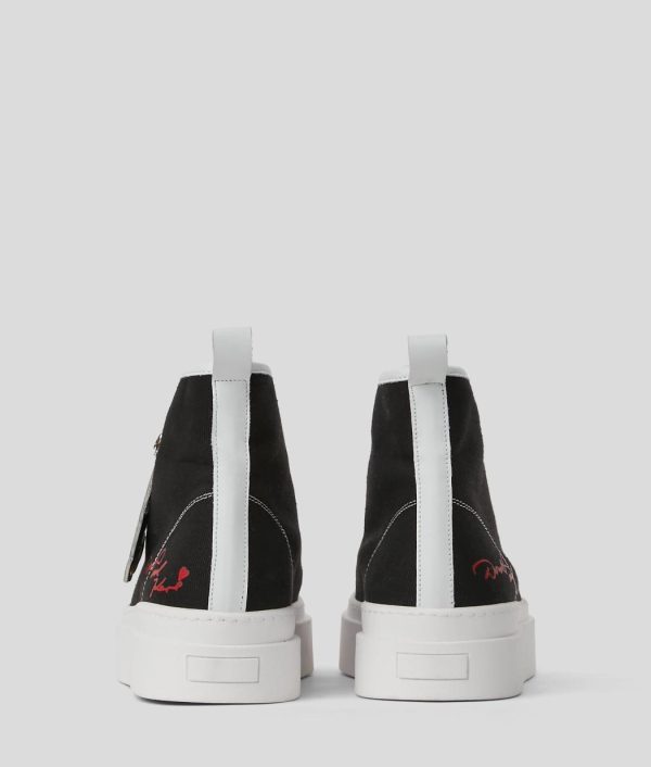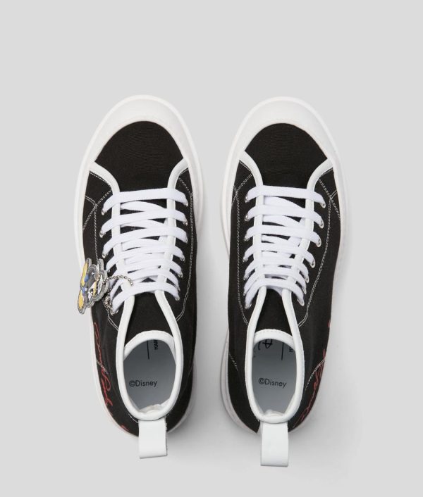 Entdecken Sie diese High-Top Sneakers in limitierter Auflage aus der Disney-Kapselkollektion, die eine verspielte Neuinterpretation von Donald Duck im Stil von Karl Lagerfeld zeigen. Sie verfügen über ein klassisches Schnürdesign mit einer Zehenkappe aus Kautschuk, während ein verspielter Anhänger und eine kontrastierende Kollaborationsstickerei einen einzigartigen, modernen Touch verleihen.