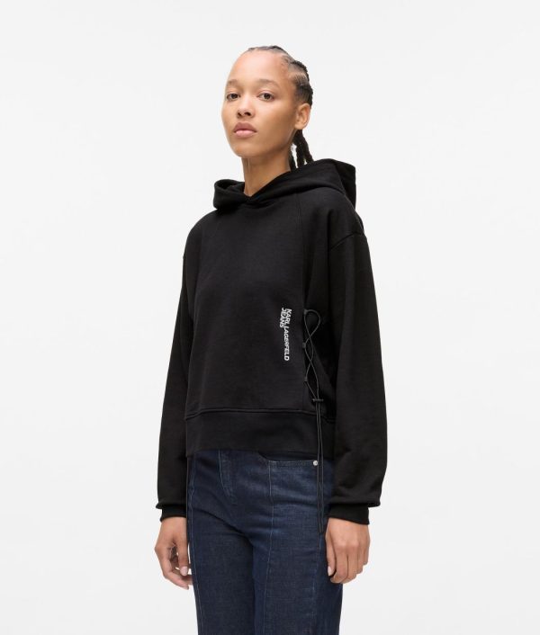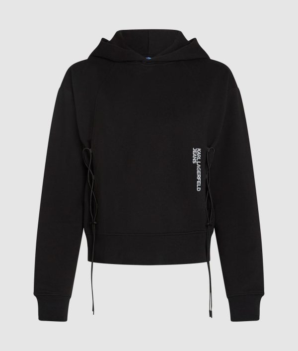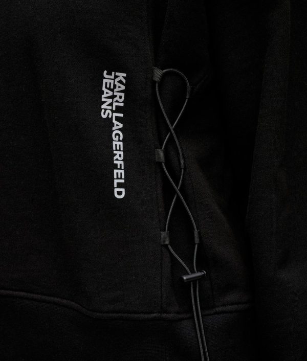 - Vertikal verlaufender, reflektierender Logo-Print auf der linken Seite