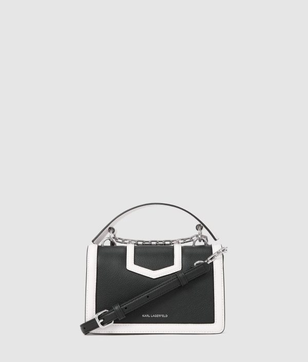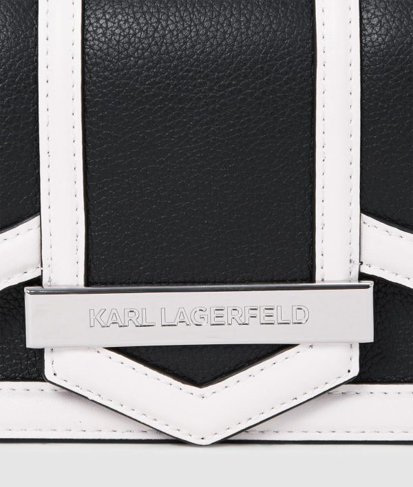 Ein auffälliges Colorblock-Design definiert diese kleine Umhängetasche. Die elegante Umschlagklappe ist mit einer edlen KARL LAGERFELD-Plakette verziert. Der Tragegriff oben und der abnehmbare Riemen mit Kettendetails sorgen für einen herausragenden Stil und Vielseitigkeit.