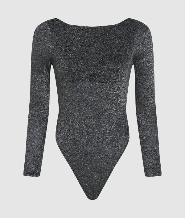 Dieser schimmernde Body mit Tanga macht die Grenzen zwischen Dessous und Konfektionskleidung unbemerkbar. Er verfügt über einen ultra-schicken Bootskragen und elegante lange Ärmel, was ihn perfekt für das Layern oder als Solo-Styling macht.